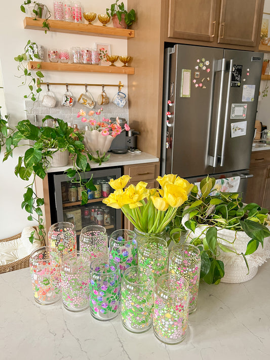 Hart and Flora creates garden-inspired products to make your day a bit more magical. Designed with love and crafted with care, our high-quality products are made to last and bring joy. Surround yourself with color, florals, and pollinators with our one of a kind bestselling dishwasher safe glassware.